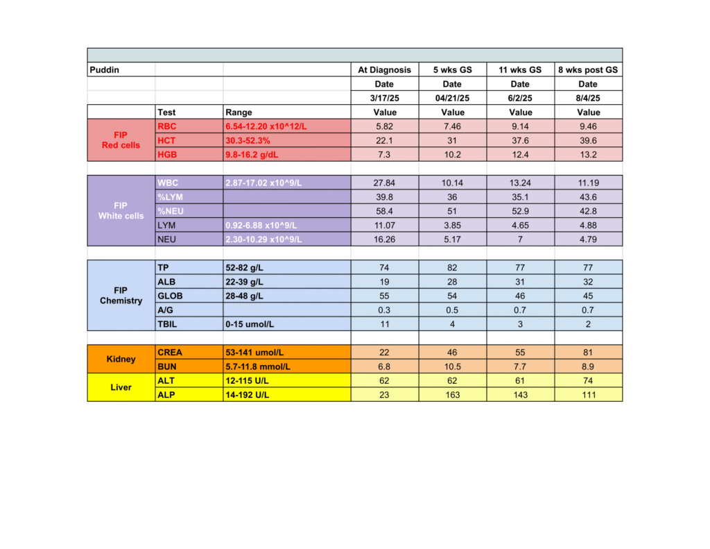 On June 2nd, Puddin weighed 3.4kg and new bloodwork was run. His FIP markers had fully resolved and his owner and veterinarian had no clinical concerns. On June 10th, treatment was stopped. Puddin was 3.7kg and doing absolutely fantastic.