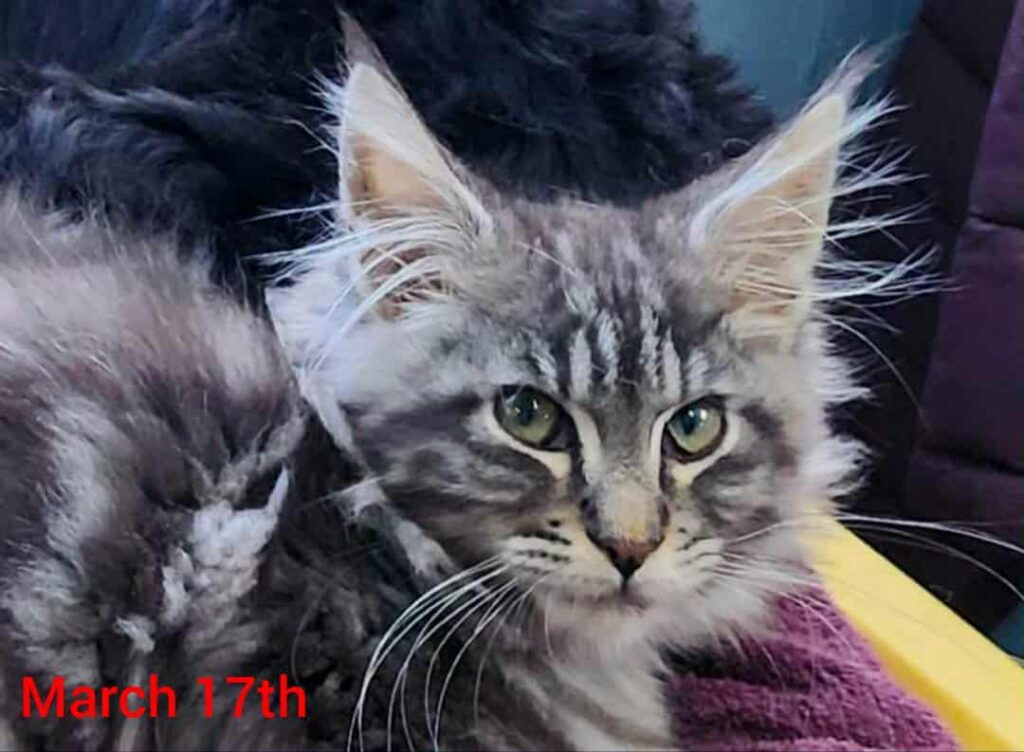 3 days into treatment, Puddin was much more alert, walking around more and his abdomen was slightly smaller. By March 24th, he was running and playing like a normal kitten.